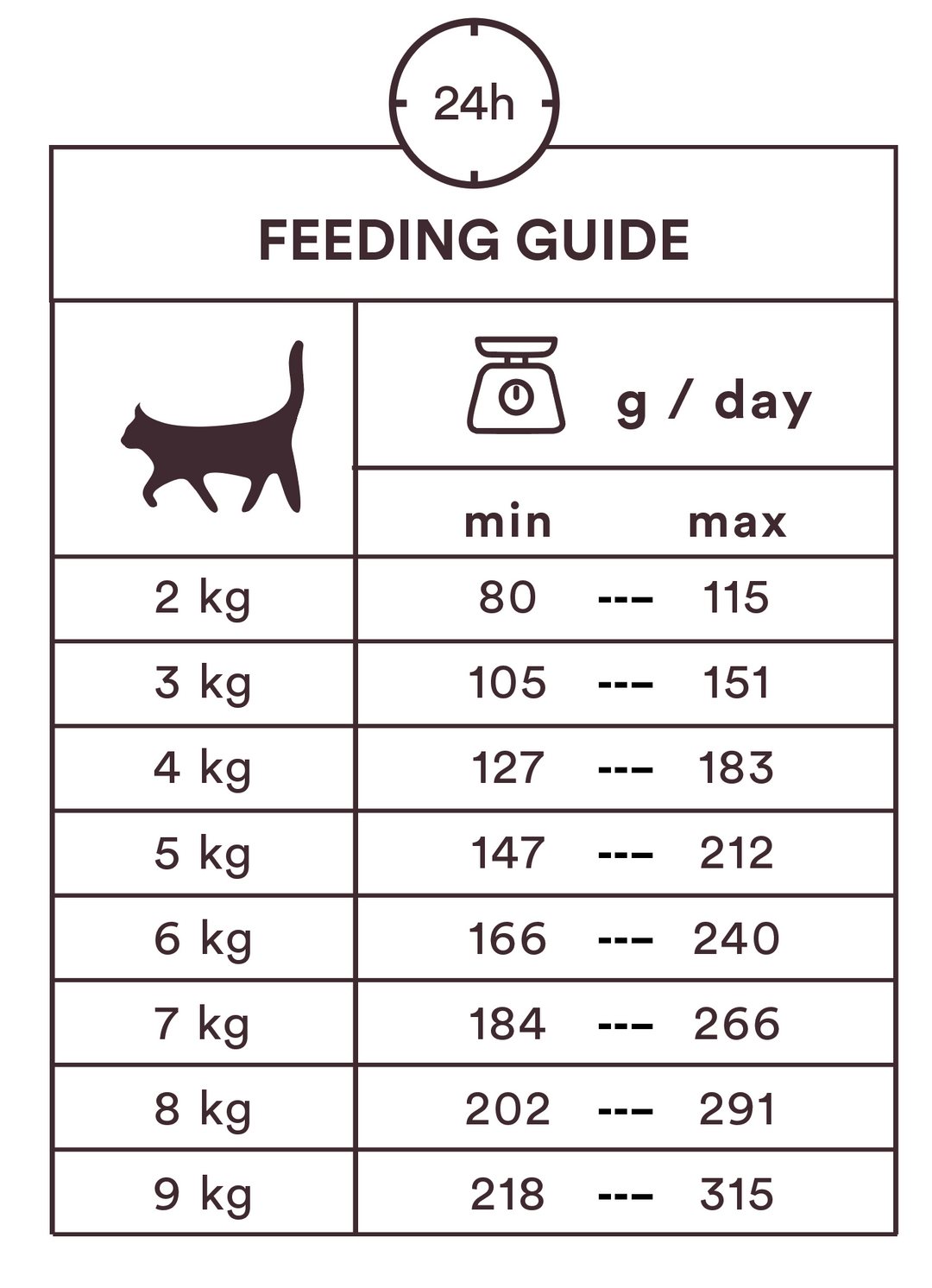 Den daglige fodermængde afhænger af kattens vægt, aktivitetsniveau og individuelle behov.