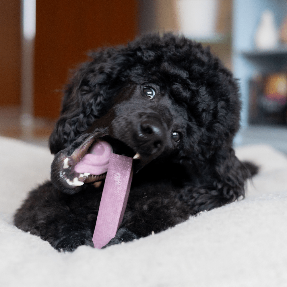 Den faste konsistens giver lang tyggetid, som både skaber fornøjelse, mindsker stress og understøtter den naturlige tandpleje ved at hjælpe med at forebygge plak og tandsten.