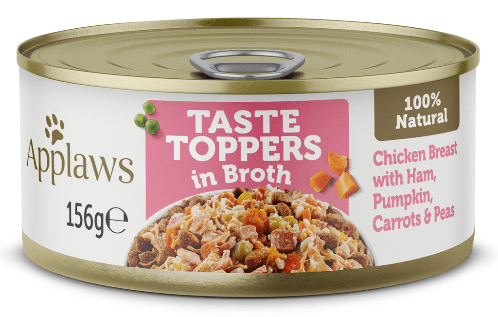 Gør din hunds måltid både sundere og mere spændende med Applaws Taste Toppers in Broth – en lækker blanding af kyllingebryst, skinke, græskar, gulerødder og ærter i en velsmagende, naturlig bouillon.