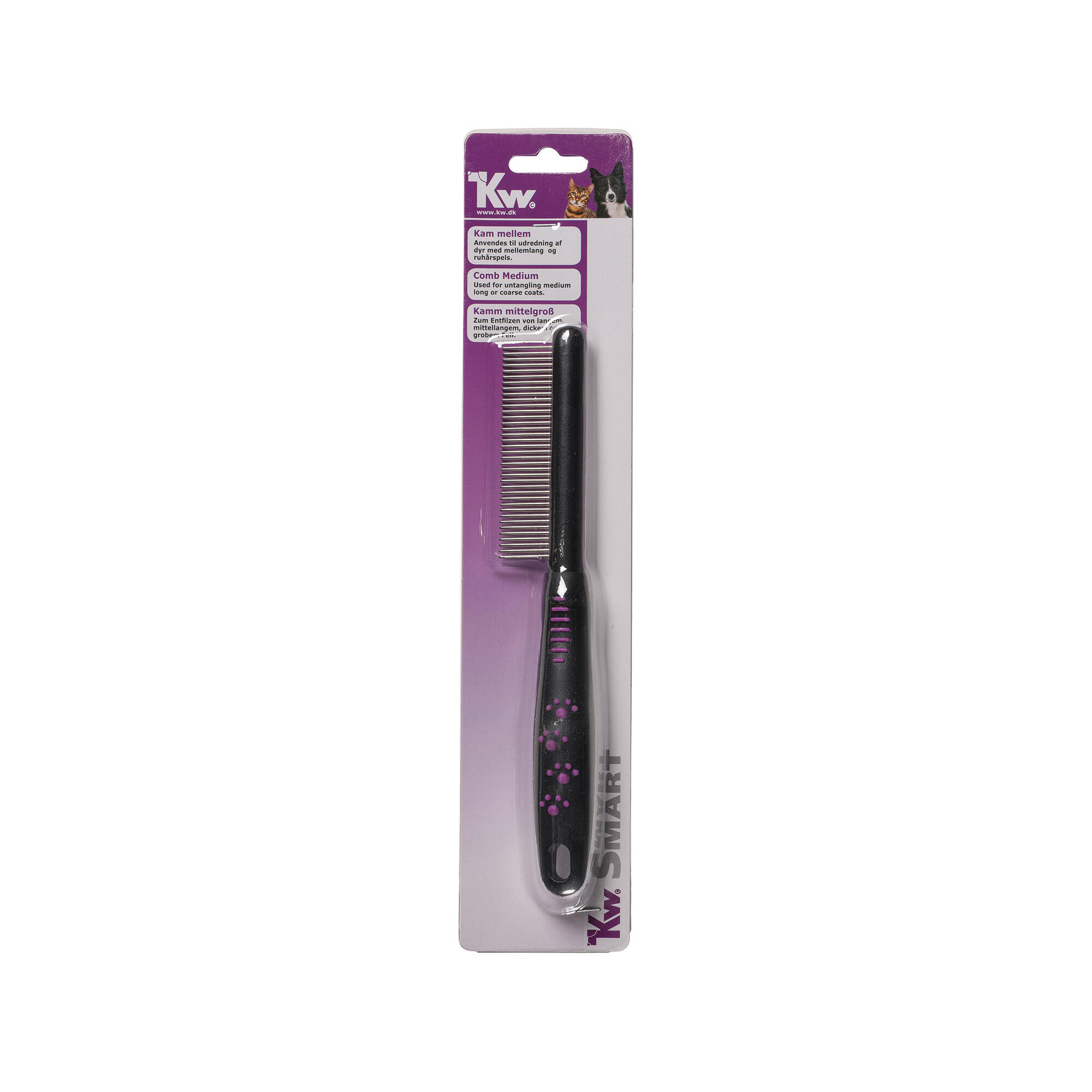 KW Smart Kam Mellem er udviklet til effektiv udredning af mellemlang og ruhåret pels hos hunde som f.eks. Golden Retriever, Pomeranian, Hønsehund og Schnauzer. Den er designet med et komfortabelt håndtag, der giver et sikkert og ergonomisk greb under pelsplejen.