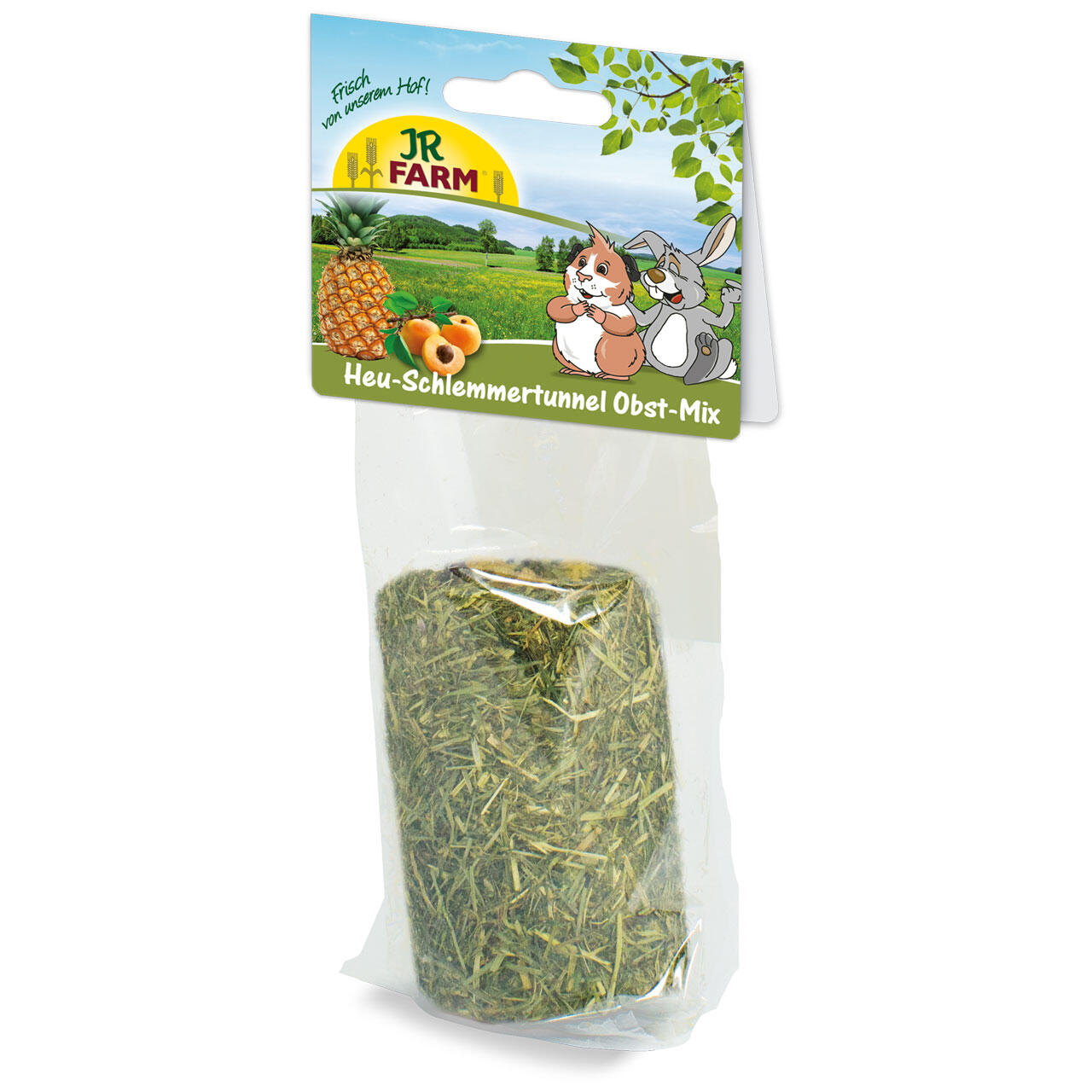 JR Farm Høtunnel Fyldt med Frugt er både en lækker snack og et naturligt aktivitetslegetøj til små gnavere og dværgkaniner. Tunnelen er fremstillet af 100% naturmaterialer uden brug af lim og kan spises i sin helhed. Fyldet består af aromatisk bjergenghø kombineret med frugt som banan, ananas og abrikos, hvilket giver en sød og fiberrig smagsoplevelse.