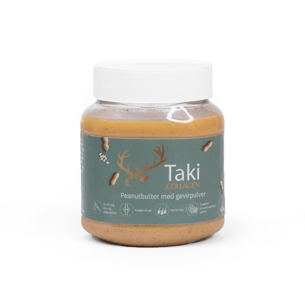 Taki Collagen Peanutbutter med gevirpulver er et sundt og velsmagende tilskud til hunde. Den kan bruges som fyld i aktivitetslegetøj, som belønning eller som et lækkert supplement ovenpå foderet.