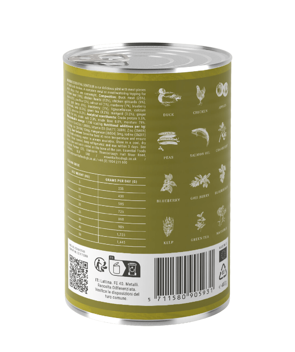 ESSENTIAL CONTOUR PÂTÉ er en kornfri paté med kødstykker af and og kylling, særligt udviklet til hunde med tendens til overvægt samt steriliserede/kastrerede hunde. Den kan serveres som et fuldfoder måltid eller som en lækker topping, der både giver mæthedsfornemmelse og smag.