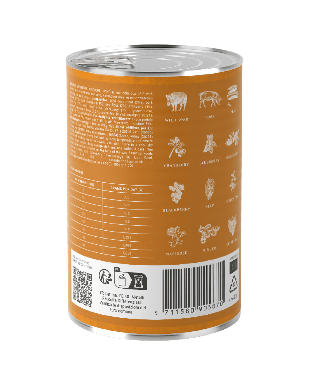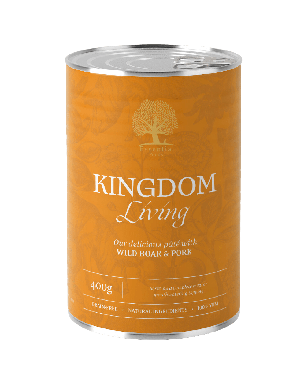 ESSENTIAL KINGDOM LIVING PÂTÉ er en uimodståelig kornfri paté med saftigt vildsvin og gris. Den kan serveres som fuldfoder til voksne hunde eller som en lækker topping på tørfoder. Med sit høje kødindhold, naturlige ingredienser og unikke smag er det en variant, der virkelig skiller sig ud.