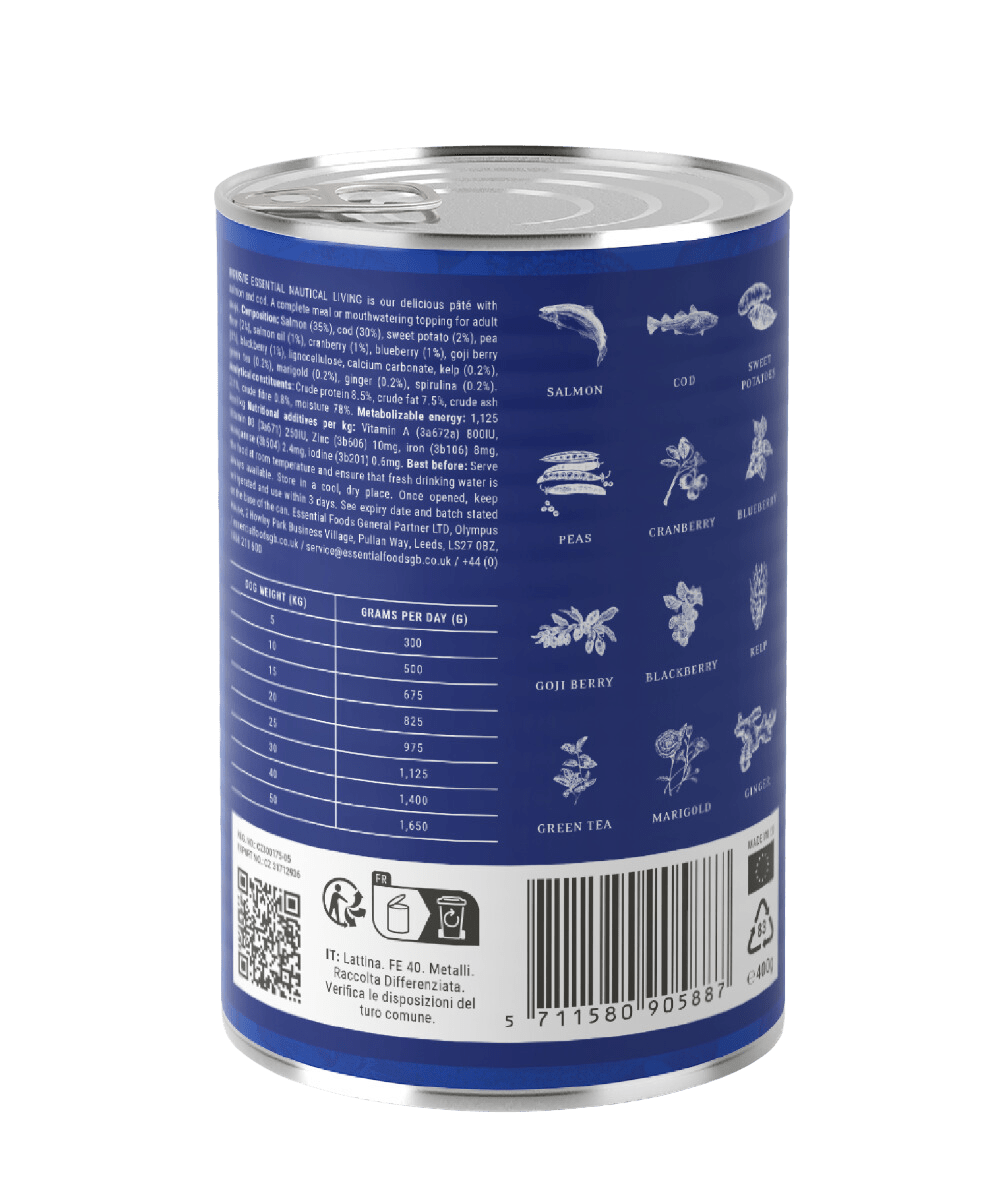 ESSENTIAL NAUTICAL LIVING PÂTÉ er en lækker kornfri paté med laks og torsk til voksne hunde. Den kan serveres som et fuldfoder måltid eller bruges som en smagfuld topping ovenpå kroketter. Med fisk som hovedingrediens og naturlige råvarer er denne paté et oplagt valg til hunde, der elsker smagen af havet.