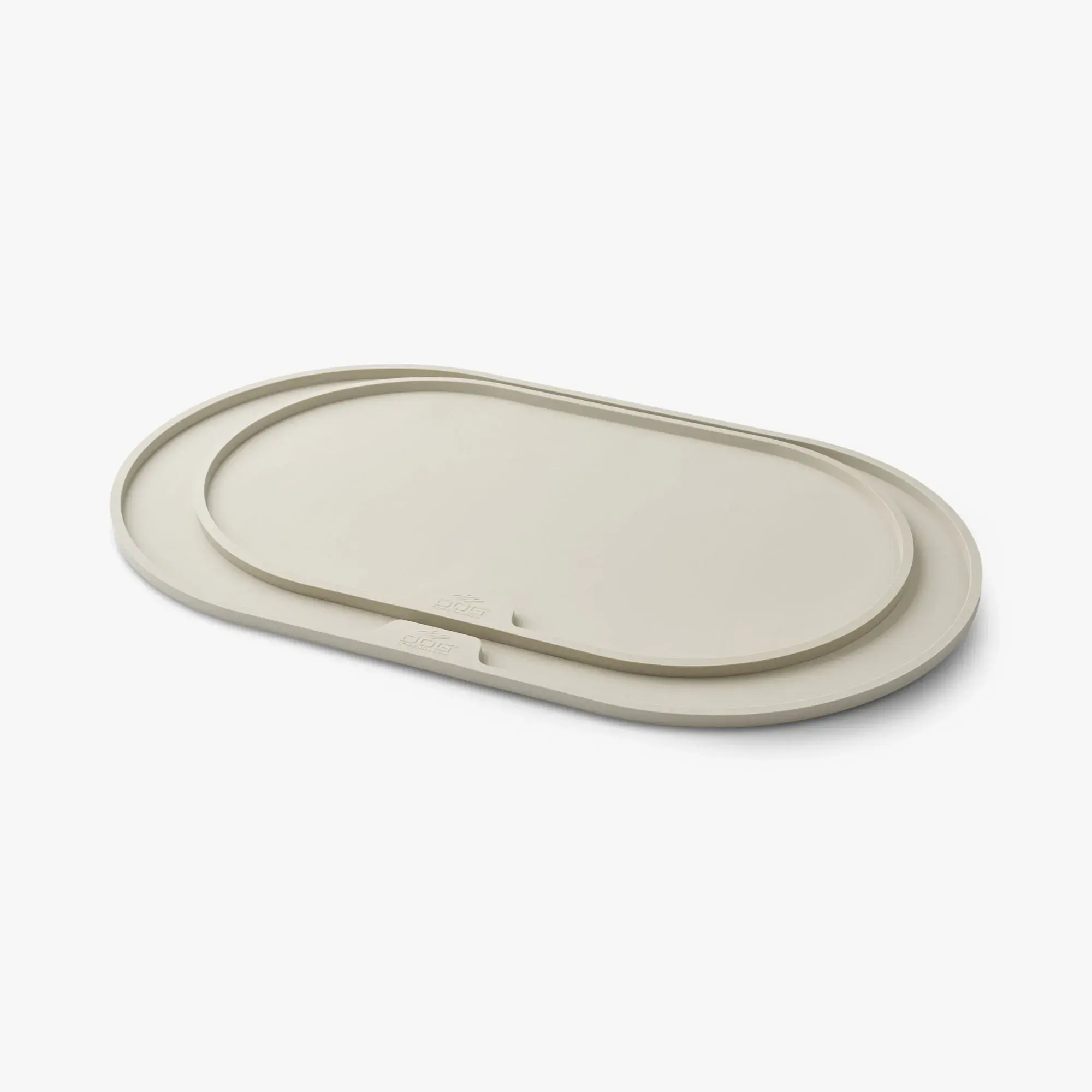 De hævede kanter holder effektivt på det spildte og den smukke ovale form passer til ethvert interiør. Fremstillet af fødevaregodkendt silikone der kan rengøres i hånden eller kommes i opvaskemaskinen.