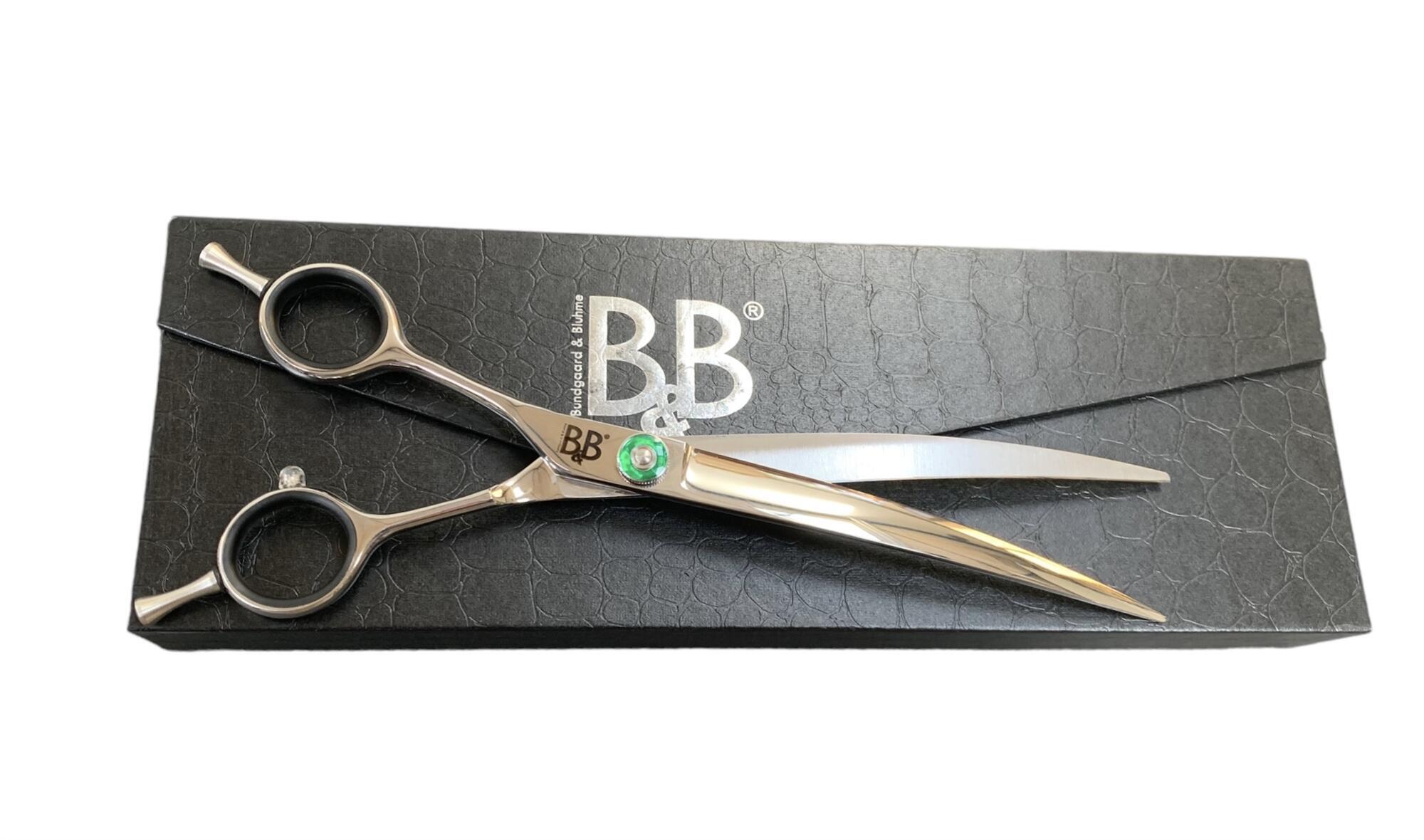 B&B´s professionelle lange og buede saks i 7,5" (19 cm.), er designet til at skulptere alle bløde og runde former på hunden, med et flot resultat
