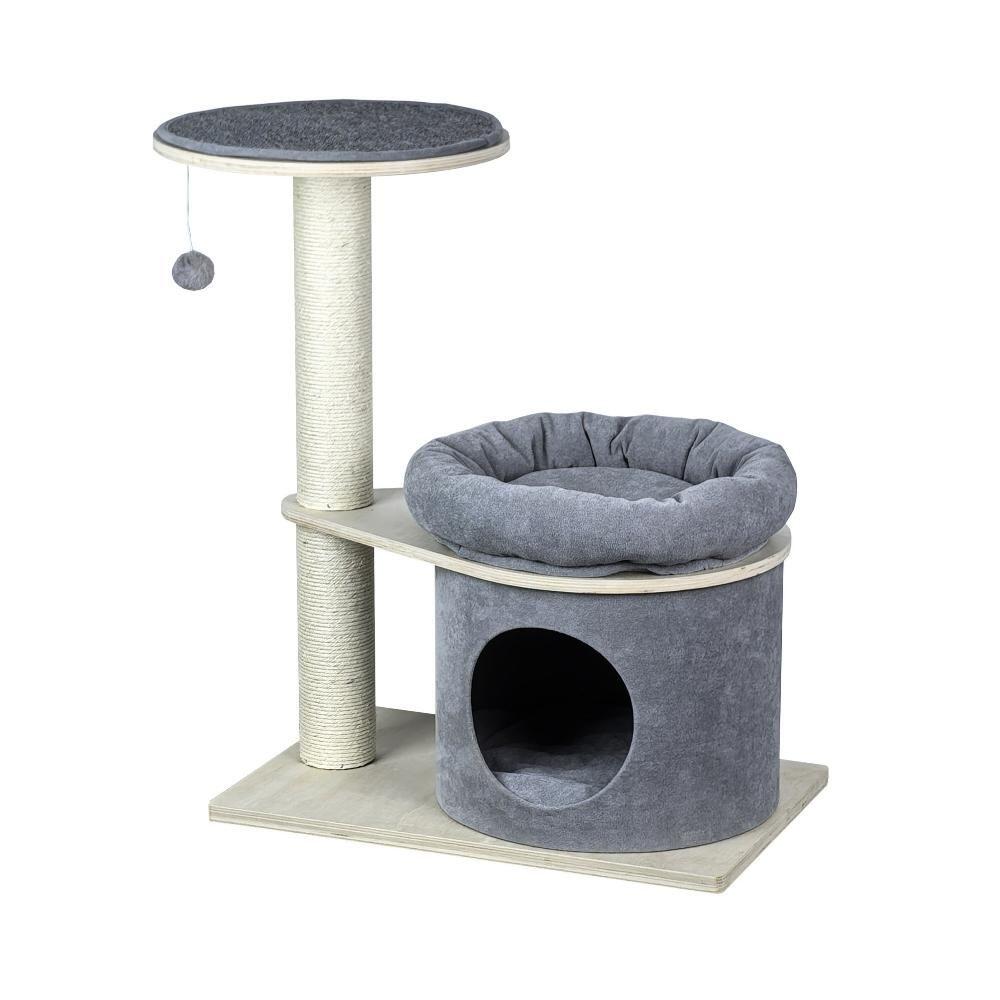Kuma 3 fra Nordic Paws er et flot og robust kradsemøbel, der kombinerer stabilitet, komfort og leg i ét design. Med en polstret hule, en rummelig platform og en blød katteseng giver det katten både afslapning og aktivitet. Den kraftige sisalbeklædte stolpe gør det nemt for katten at vedligeholde kløerne på en sund og naturlig måde.